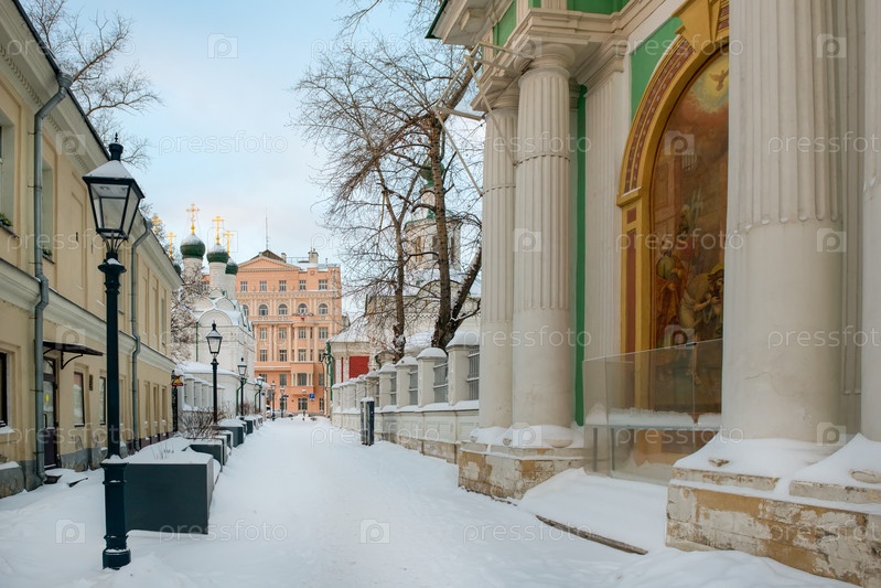 Москва, Россия - 17 января 2021 г.: Вид на Черниговский переулок морозным зимним утром после сильного снегопада