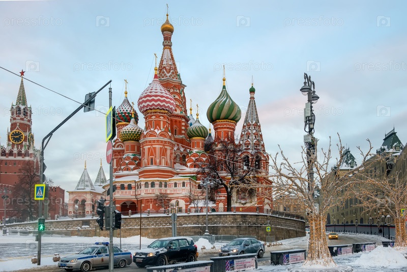 МОСКВА, РОССИЯ - 17 января 2021 г.: Вид на Васильевский спуск, Красную площадь, собор Василия Блаженного и Спасскую башню Московского Кремля морозным зимним утром