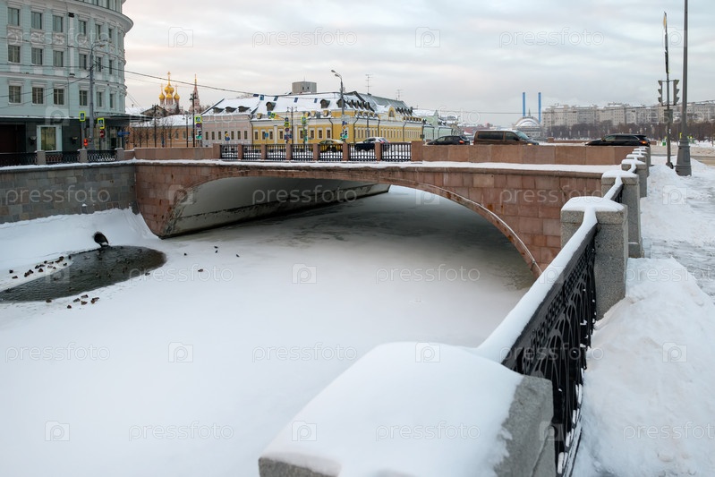 Вид с Малого Москворецкого моста на водоотвод в Москве морозным зимним утром
