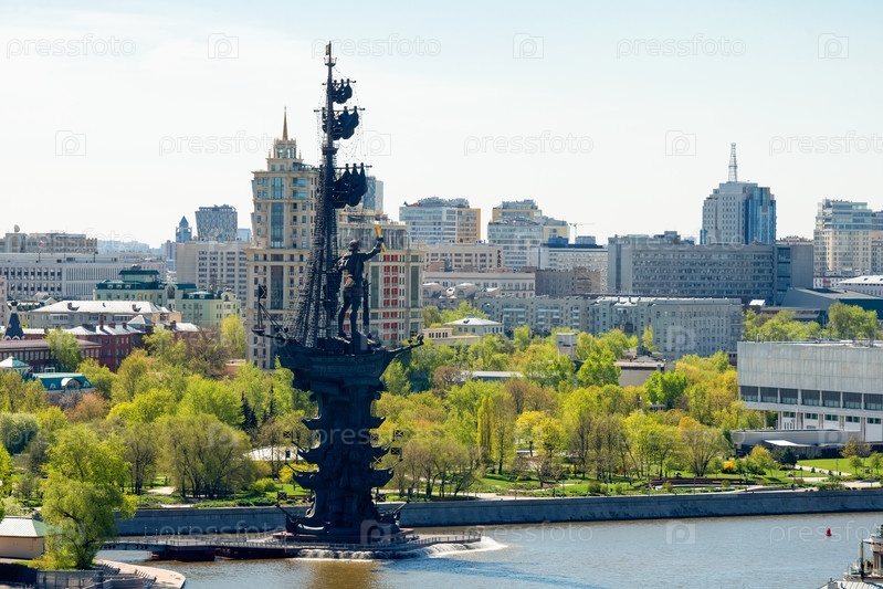 Москва, Россия - 10 мая 2021 г.: Вид на памятник Петру Великому с Москвы-реки. Панорама Москвы, парк искусств Музеон и Москва-река с высоты