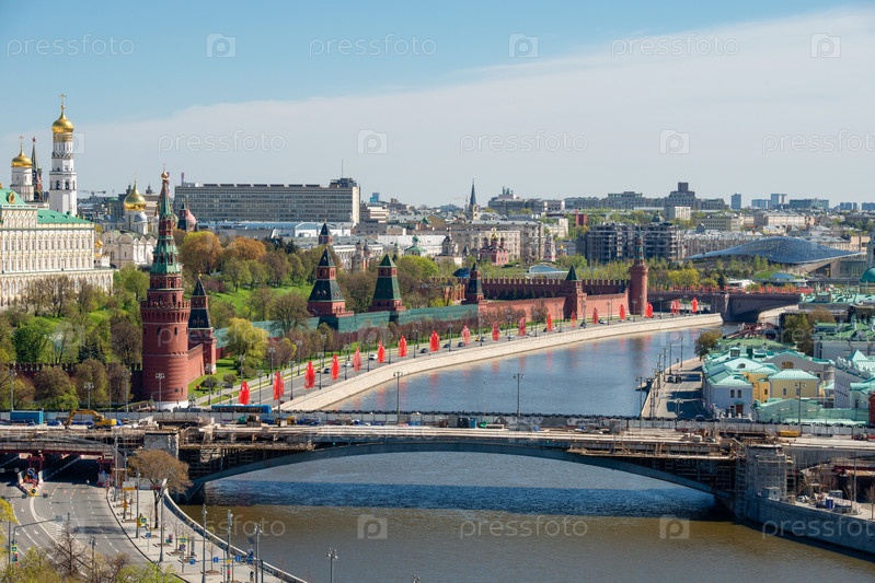 Вид с воздуха на Московский Кремль, Москву-реку и набережную Кремля в весенний день