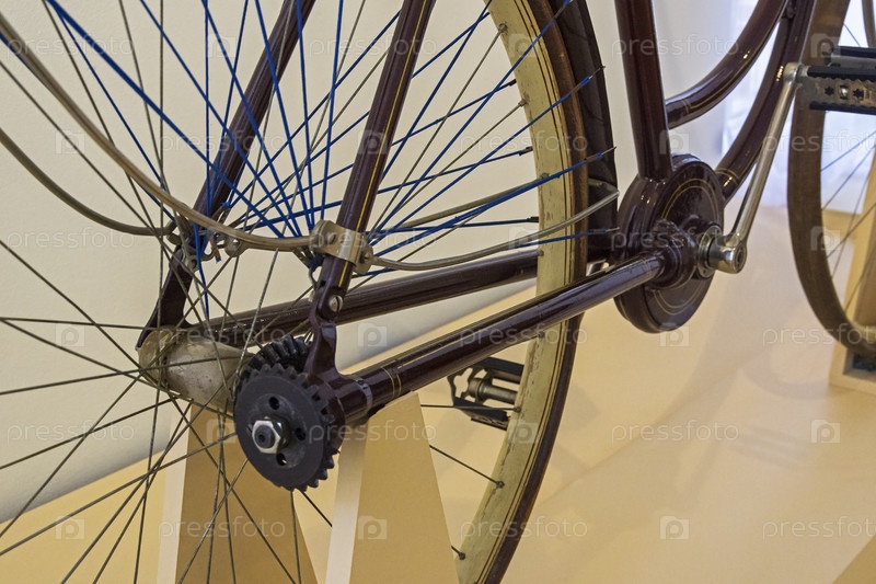 Старый велосипед оригинальной конструкции - движение от педалей к колесу передается валом с конической зубчатой передачей. Музей в Царицыно, Москва