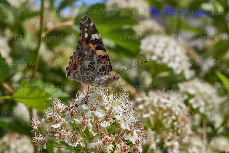 Леди бабочка (лат. Vanessa cardui) на соцветии спиреи