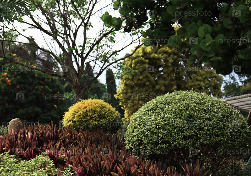 Ландшафтный дизайн с зелеными, желтыми и красными растениями