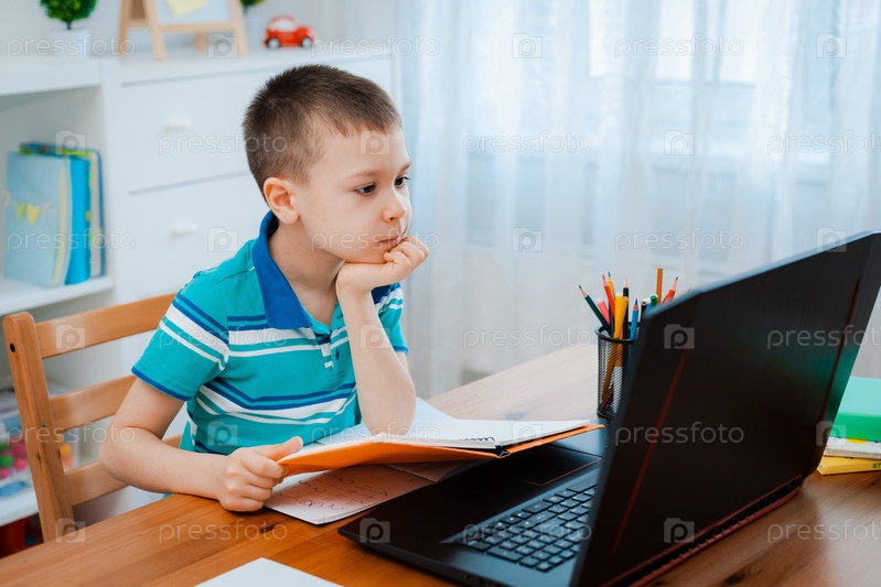 Дистанционное обучение онлайн образование. Школьник учится дома и делает домашнее задание. Домашнее дистанционное обучение