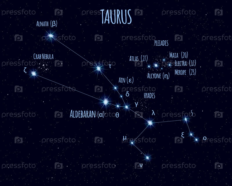 Созвездие Тельца (Быка), иллюстрация с названиями основных звезд на фоне звездного неба