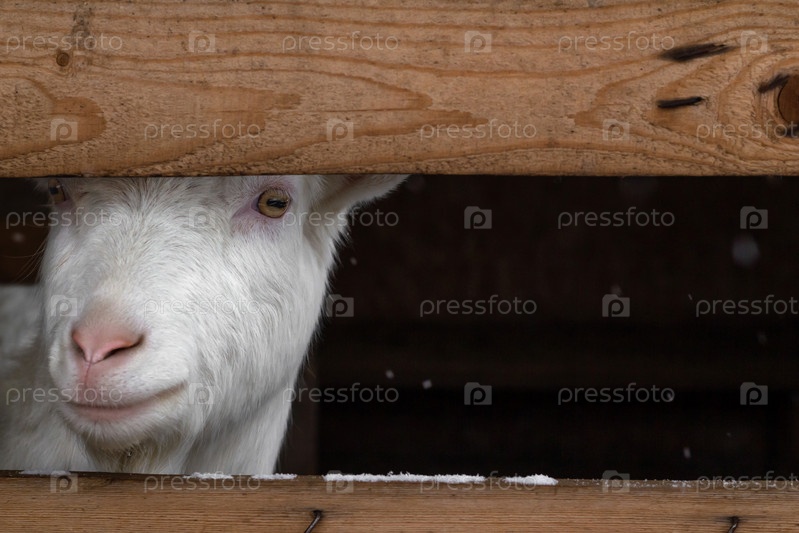 Из-за забора выглядывает белая коза зааненской породы. На темном фоне видна только часть головы животного, место для текста