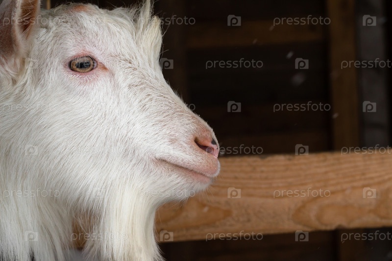 Голова молодого козленка зааненской породы выглядывает из сарая на скотном дворе. Место для текста