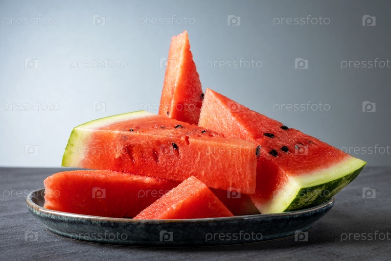 Нарезанные кусочки спелого сладкого арбуза лежат на серой керамической тарелке