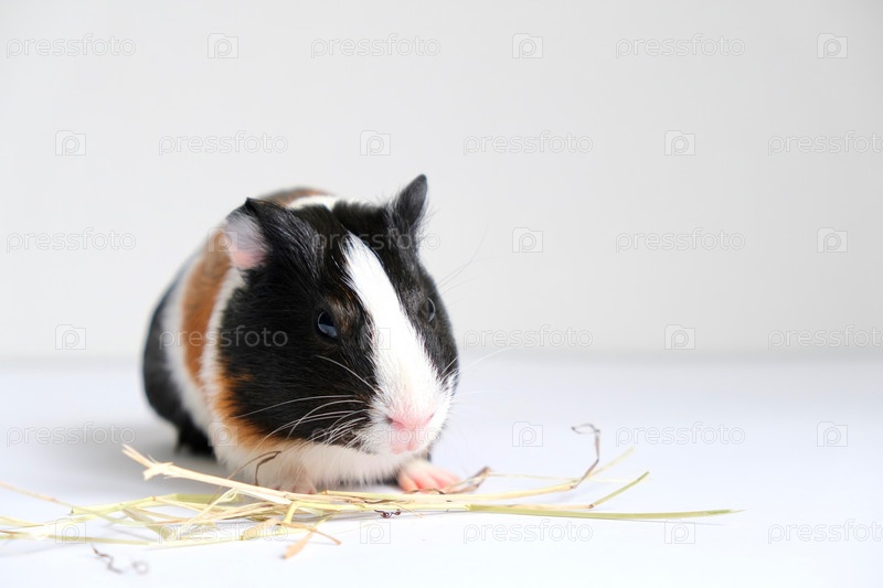 Трехцветная морская свинка на белом фоне. Домашнее животное, грызун