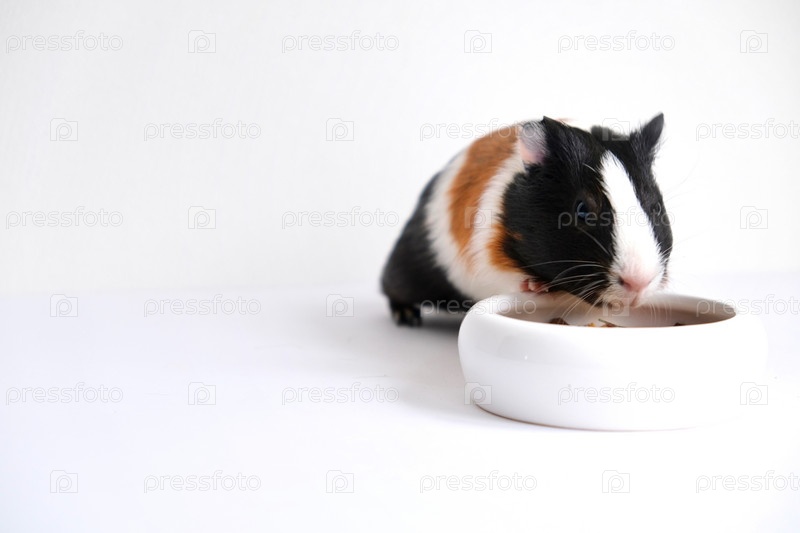 Трехцветная морская свинка на белом фоне. Домашнее животное, грызун