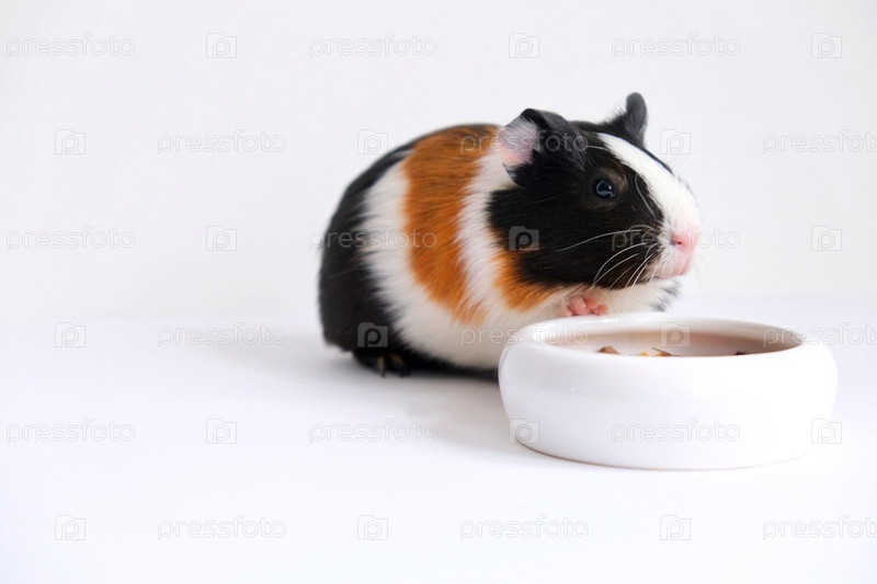 Трехцветная морская свинка на белом фоне ест еду из миски. Домашнее животное, грызун
