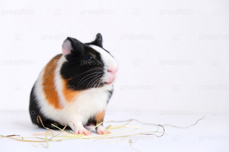 Трехцветная морская свинка на белом фоне ест пищу. Домашнее животное, грызун