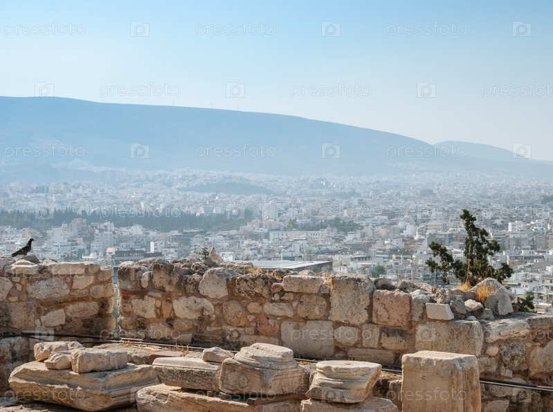 Греция, Афины. Исторические развалины Акрополиса и вид на современный город