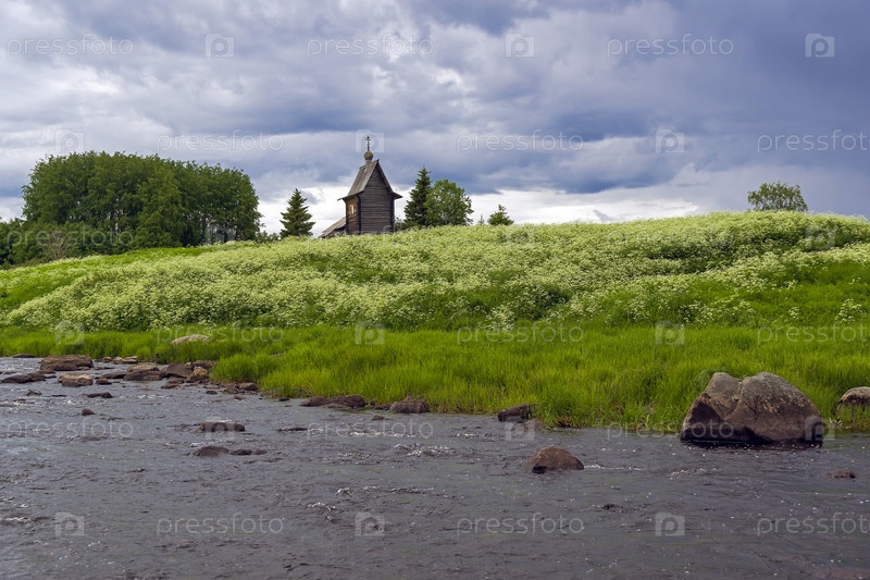 Деревянная часовня на берегу реки Кереть в месте впадения реки в Белое море. Карелия, Россия, конец июня