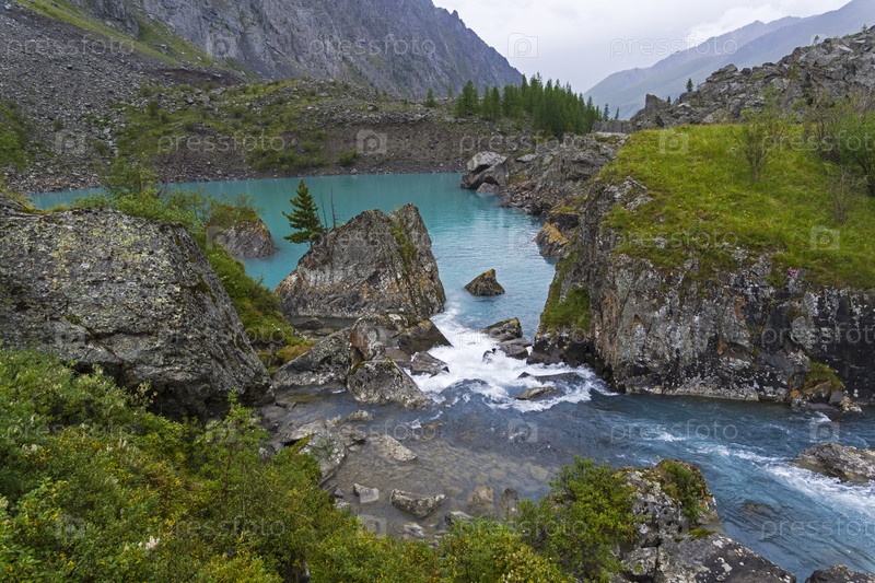 Вода переливается через небольшой порог между двумя частями Верхнего Шавлинского озера. Август, Горный Алтай