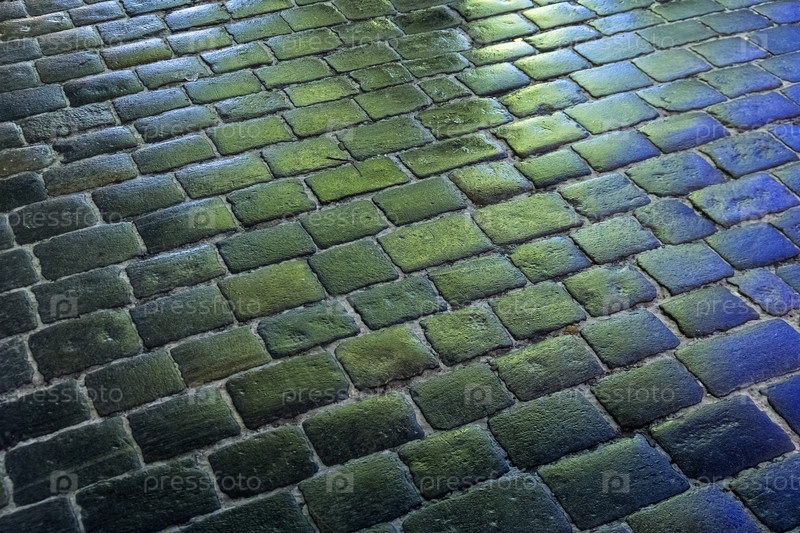 Мокрая блестящая брусчатка в электрическом свете как фон