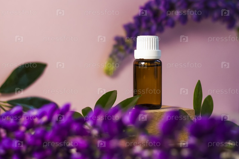 Бутылка без этикетки с маслом на подставке. Прозрачная стеклянная тара с дозатором на бежево-розовом фоне. Баннер продукта. Место для текста, дизайн
