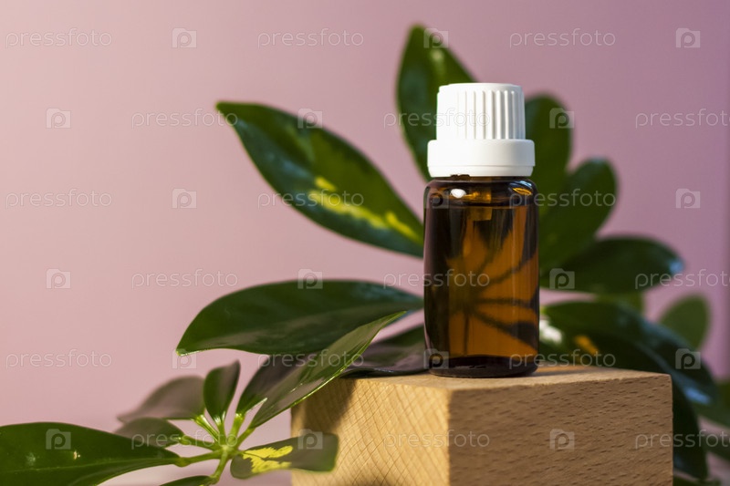 Бутылка без этикетки с маслом на подставке. Прозрачная стеклянная тара с дозатором на бежево-розовом фоне. Баннер продукта. Место для текста, дизайн