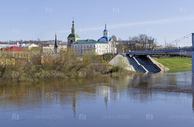 Вид через Днепр на церковь Святого Николая. Смоленск, конец апреля, солнечный день