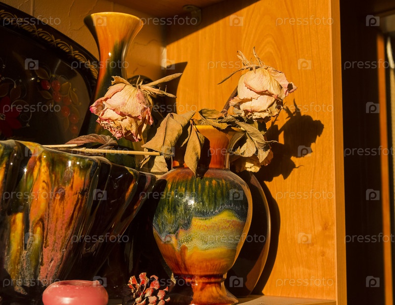 Засохшие розы в керамической вазе под яркими солнечными лучами