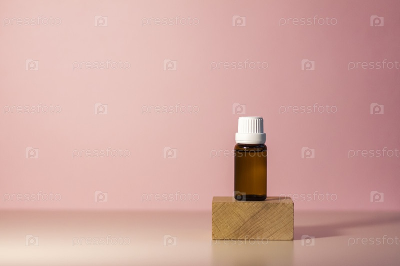 Бутылка без этикетки с маслом на подставке. Прозрачная стеклянная тара с дозатором на бежево-розовом фоне. Баннер продукта. Место для текста, дизайн