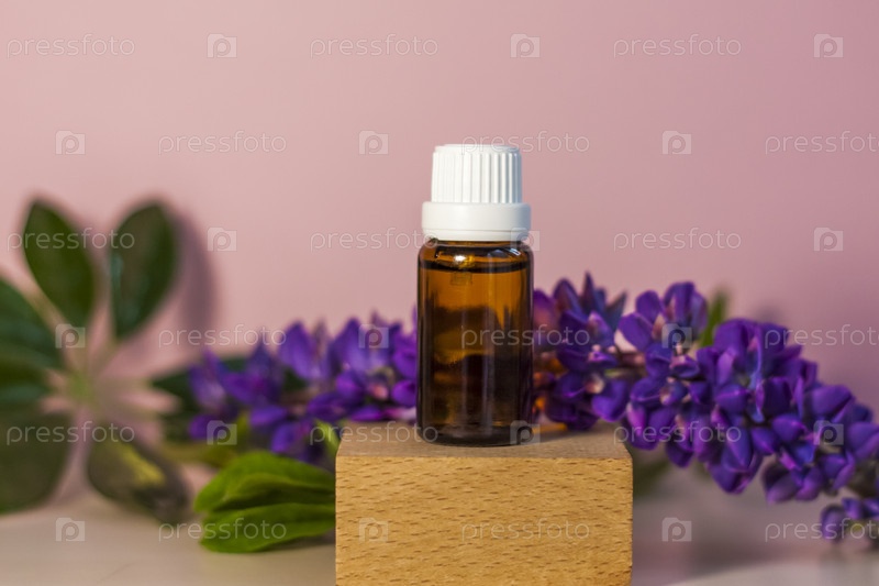 Бутылка без этикетки с маслом на подставке. Прозрачная стеклянная тара с дозатором на бежево-розовом фоне. Баннер продукта. Место для текста, дизайн
