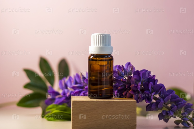Бутылка без этикетки с маслом на подставке. Прозрачная стеклянная тара с дозатором на бежево-розовом фоне. Баннер продукта. Место для текста, дизайн