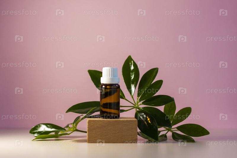 Бутылка без этикетки с маслом на подставке. Прозрачная стеклянная тара с дозатором на бежево-розовом фоне. Баннер продукта. Место для текста, дизайн