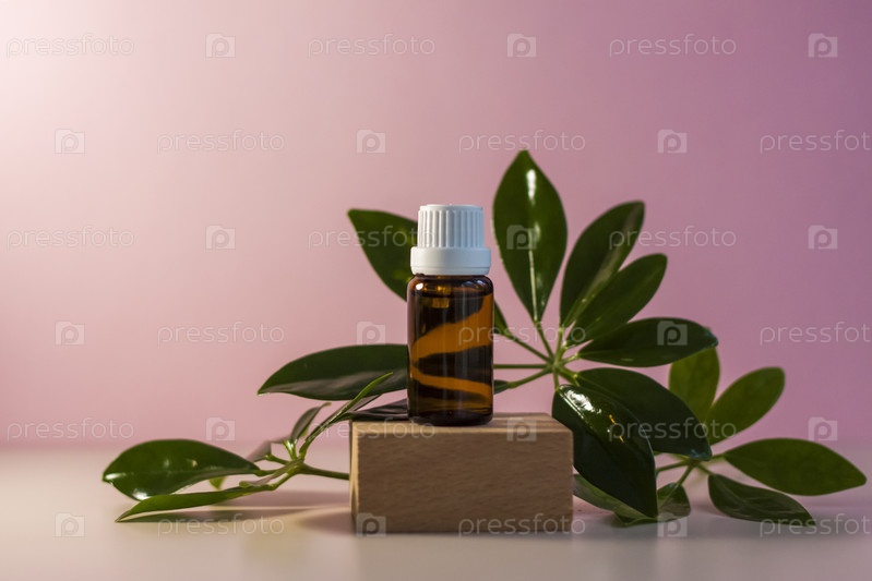 Бутылка без этикетки с маслом на подставке. Прозрачная стеклянная тара с дозатором на бежево-розовом фоне. Баннер продукта. Место для текста, дизайн