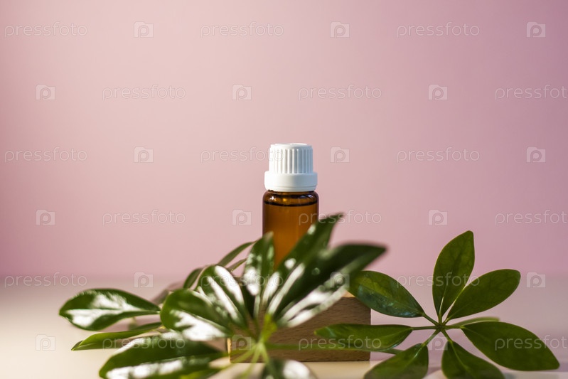 Бутылка без этикетки с маслом на подставке. Прозрачная стеклянная тара с дозатором на бежево-розовом фоне. Баннер продукта. Место для текста, дизайн