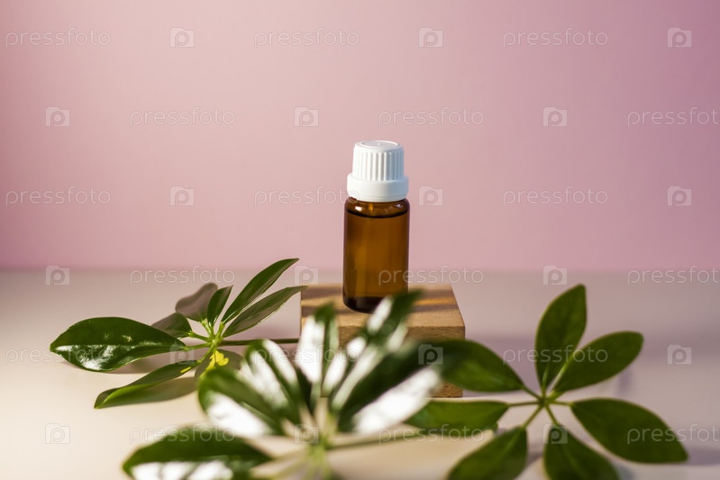 Бутылка без этикетки с маслом на подставке. Прозрачная стеклянная тара с дозатором на бежево-розовом фоне. Баннер продукта. Место для текста, дизайн