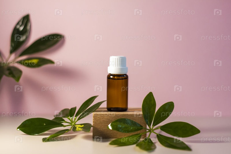Бутылка без этикетки с маслом на подставке. Прозрачная стеклянная тара с дозатором на бежево-розовом фоне. Баннер продукта. Место для текста, дизайн