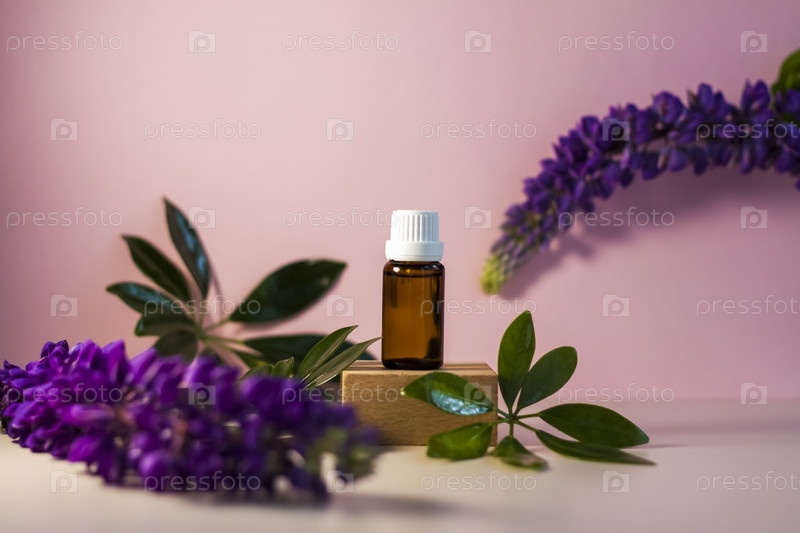 Бутылка без этикетки с маслом на подставке. Прозрачная стеклянная тара с дозатором на бежево-розовом фоне. Баннер продукта. Место для текста, дизайн