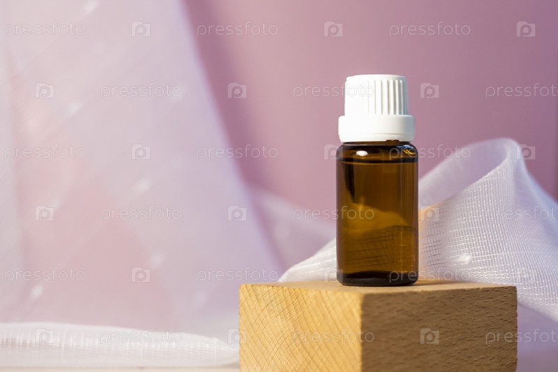 Бутылка без этикетки с маслом на подставке. Прозрачная стеклянная тара с дозатором на бежево-розовом фоне. Баннер продукта. Место для текста, дизайн