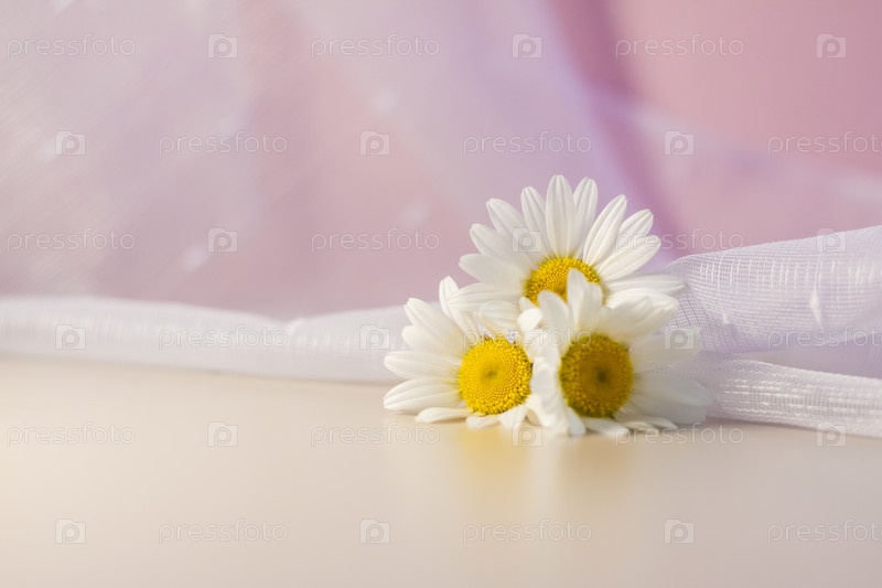 Белые ромашки на бежево-розовом фоне с белой вуалью. Натуральный косметический продукт. Баннер продукта. Место для текста и дизайна