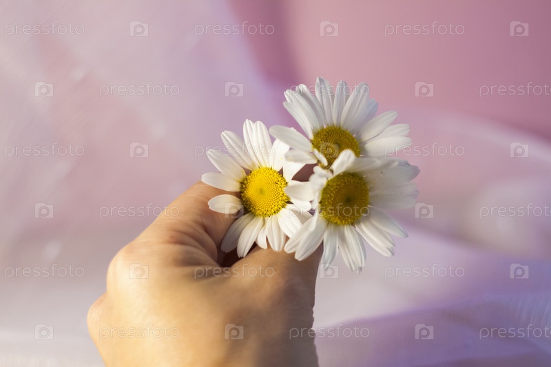 Женская рука с белыми ромашками на светлом фоне. Концепция: мягкость и нежность, омолаживающий эффект, легкость движений. Натуральный продукт