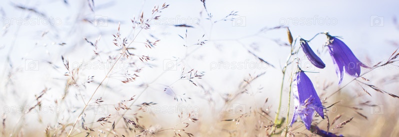 Сиреневые колокольчики в поле, на фоне гнилой травы