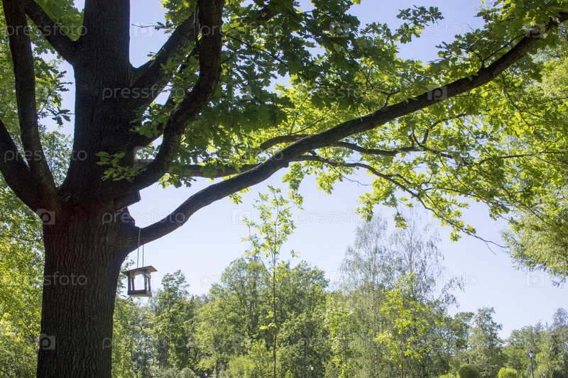 Висячий скворечник на дереве. Корм для диких птиц. Деревянный домик для птиц. Покормить птиц. Коробка без стен. Хлеб и сухарики в кормушке. Весенний парк