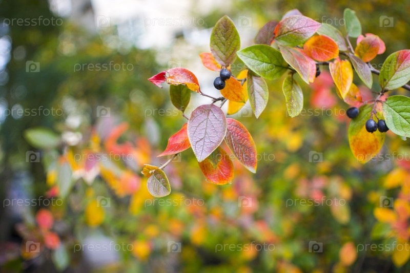 Яркий осенний фон листья и плоды куста аронии