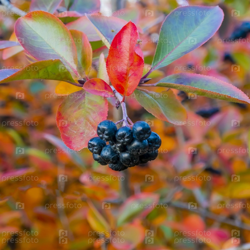 Яркий осенний фон листья и плоды куста аронии