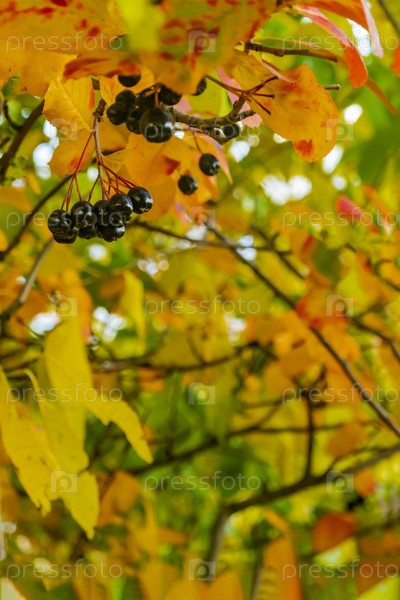 Яркий осенний фон листья и плоды куста аронии