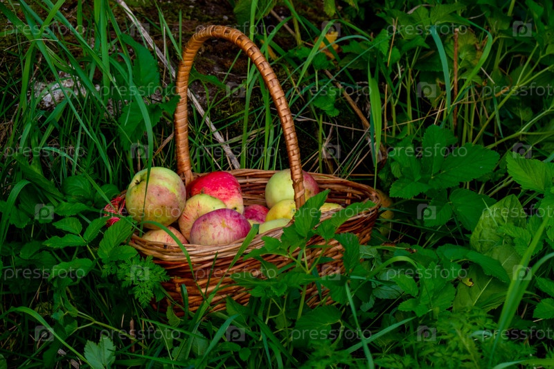 Красные и зеленые свежесобранные яблоки в корзине на зеленой траве
