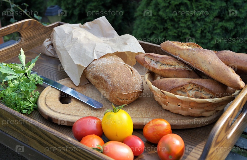 Различный хлеб на деревянном подносе с овощами