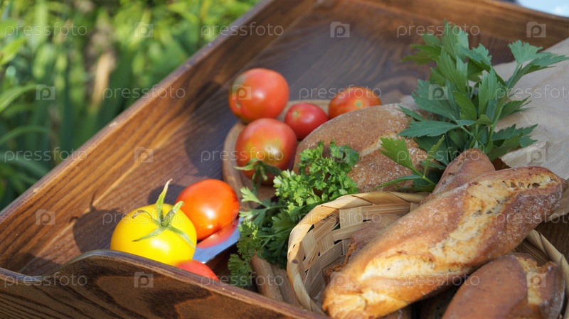 Различный хлеб на деревянном подносе с овощами
