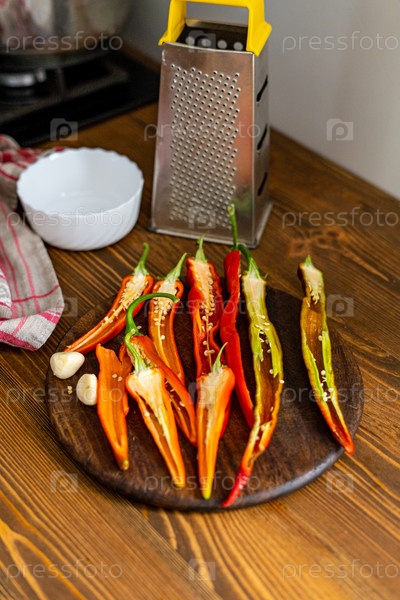 Нарезать стручки красного острого перца на деревянной доске