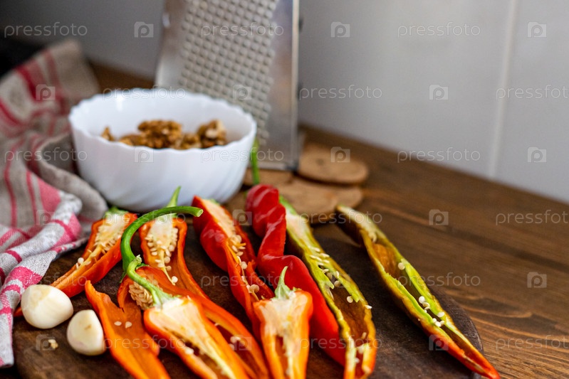 Нарезать стручки красного острого перца на деревянной доске