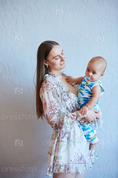 Мама с новорожденным мальчиком на фоне простой светлой стены. Понятие материнства и детства