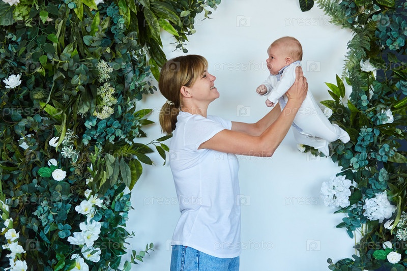 Мать с новорожденным мальчиком стоит в комнате, украшенной растениями и цветами. Понятие материнства и детства