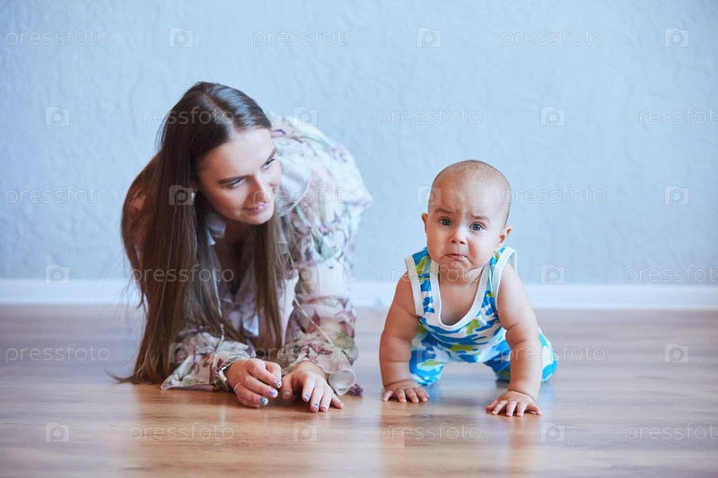 Мама с новорожденным мальчиком на фоне простой светлой стены. Понятие материнства и детства